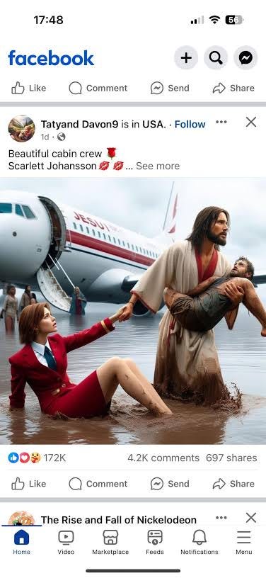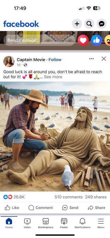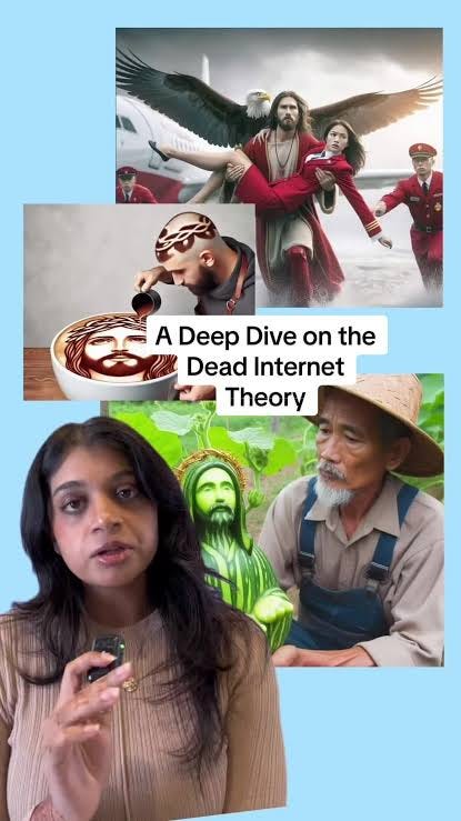 Anyway, if you log onto Facebook, you will see dead internet theory in its latest iteration, where AI appears to be prompting other AI to generate images and prompts, and then other AI comments on these AI generated images. Something strange is happening. There is a a lot of Jesus. They are talking about it on TikTok!
