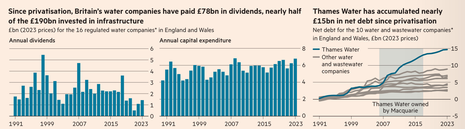 Following up on yesterday’s Thames Water story with these three charts cribbed from the FT…78bn in divvys paid out to owners … no wonder Thames Water and associates are in a rough spot. I know Seymour and co are gung-ho about regulation (whoever said this isn’t a political newsletter?) but this is the risk presented with privatising any assets here — that one-off payment looks well and nice until the taxpayer ends up bailing out the asset (this, by the way, is the problem with “free market” rubbish that gets expoused every so often…markets so free that the government comes in with a bailout. As the Tui billboards used to say “yeah, right”.)
