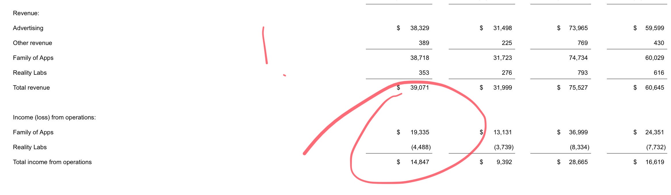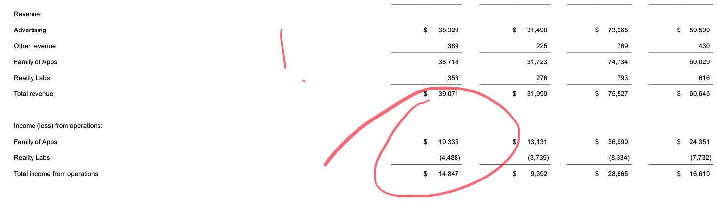Finally, Meta. Great results in the ad department (don’t let anyone tell you otherwise — Meta is an ad company). But look at how much Zuck spends on Reality Labs!