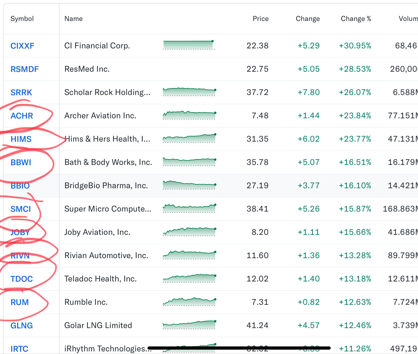 Ok. Take a breather. We are currently in uncharted waters — the other day I talked about IONQ, a “quantum computing” firm that is a likely fraud. We also have the Russell 2000, which continues to rally as a result of Trump becoming president. And look at yesterday’s top gainers — I have circled in red the ones that are big steaming piles of New York City certified Trash (TM).