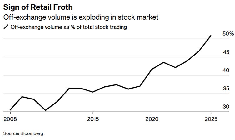 This is significant when you consider the volume of retail participation. The chart above shows that the share of off-exchange trades has risen to 50%, a proxy for retail involvement.